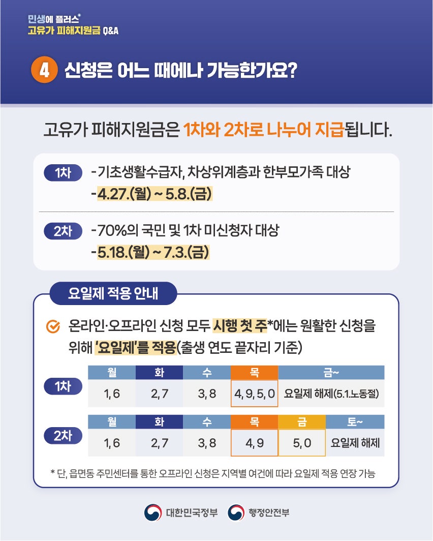 혼란을 방지하기 위해 신청은 두 단계로 나뉩니다. 먼저 기초생활수급자와 차상위계층을 대상으로 하는 1차 신청이 4월 27일부터 5월 8일까지 실시됩니다.